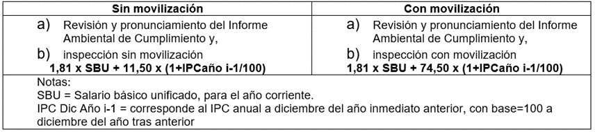Nota: De conformidad con el artículo 490 del Reglamento al Código Orgánico del Ambiente, "(...) En caso de que las observaciones no sean absueltas por el operador, de forma reiterativa, por segunda ocasión y en adelante, la Autoridad Ambiental Competente aplicará nuevamente el cobro de tasas administrativas por pronunciamiento de informes ambientales de cumplimiento."