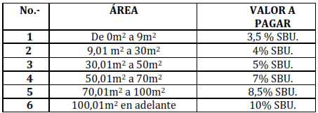 no prestar las facilidades al funcionario, para la realización de la medición del local comercial, se procederá a emitir el informe, presumiendo el área máxima determinada en la tabla de pagos. A la tasa a cobrar, se le efectuará un recargo del 10% del Salario Básico Unificado.